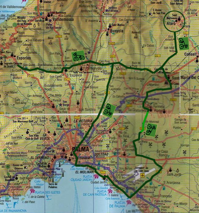 Mallorca- 5.Tag An den Gestaden des Bösen Alaro- Palmanyola- Palma de Mallorca- SÀrenal- Sa Cabaneta- Alaro 80 km 460 hm Alaro km 0- Santa Maria km 7- Palmanyola km 15- SÈsglaieta km 18,5- Sèsglaieta km 23,5- Palmanyola km 27- Palma de Mallorca km 42- SÀrenal km 49,5- Sa Cabaneta km 65- Santa Maria km 72- Alaro km 80 |